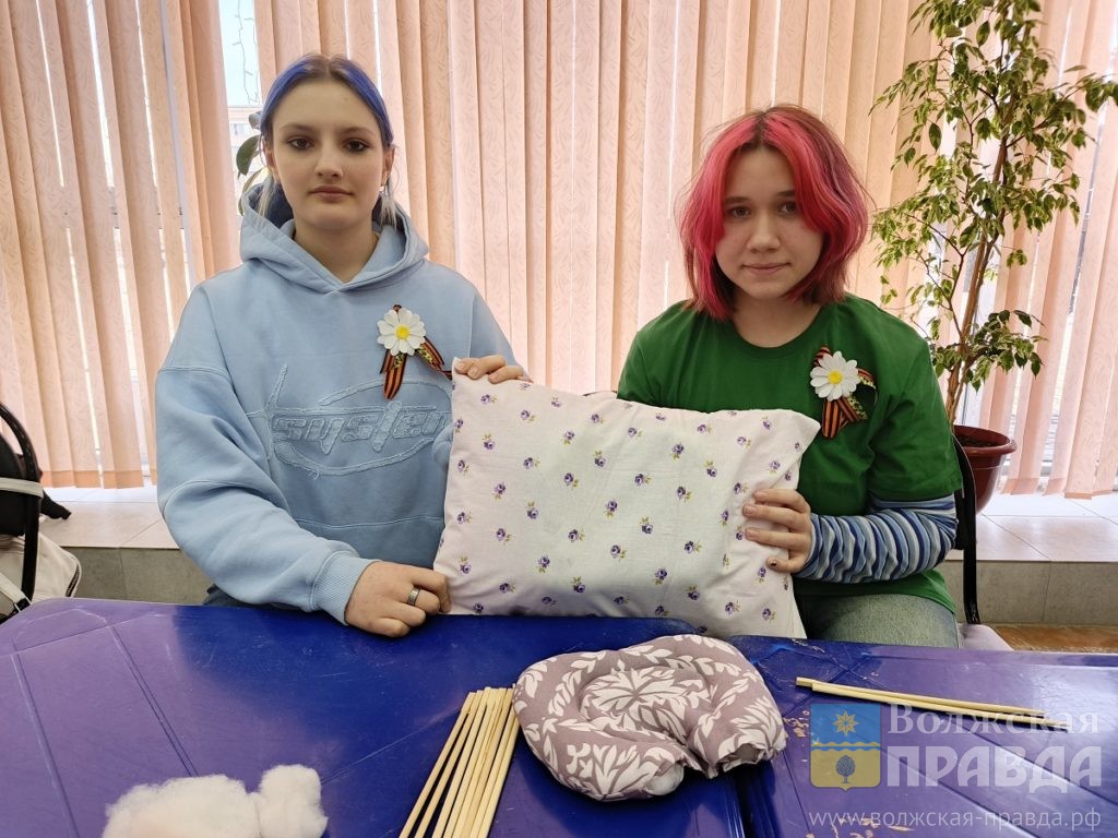 Перед началом встречи в фойе молодежного центра были организованы мастер-классы волонтерских объединений города, которые помогают защитникам Донбасса. Для солдат на передовой волжские добровольцы разных возрастов плетут маскировочные сети, вяжут носки, шьют теплые вещи, делают окопные свечи и подушки для транспортировки раненых.
