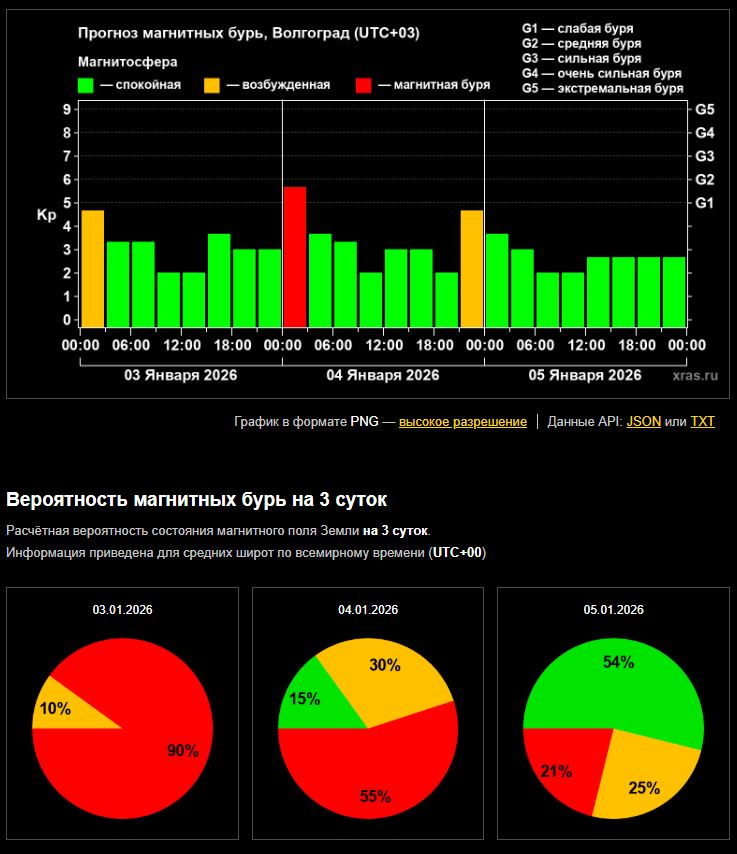 Ждать начала бури долго не пришлось — событие произошло менее чем через двое суток после новогодних праздников. Стоит отметить, что предыдущий 2025 год стартовал гораздо интенсивнее. Уже 1 января специалисты наблюдали мощную бурю уровня G4. Нынешняя буря оказалась значительно слабее — пока она классифицируется как минимальная, уровня G1. Впрочем, прогнозы говорят, что возможно усиление до уровня G2.Наибольший пик активности учёные прогнозируют уже через час, с полуночи до 03:00 4 января. Затем в колебаниях магнитного поля настанет, видимо, передышка. По прогнозам оно стабилизируется до спокойного состояния. Вероятность магнитных бурь на 4 января составляет 55%, 6 января – 21%. Следующая волна активности, возможно начнётся уже почти сутки.