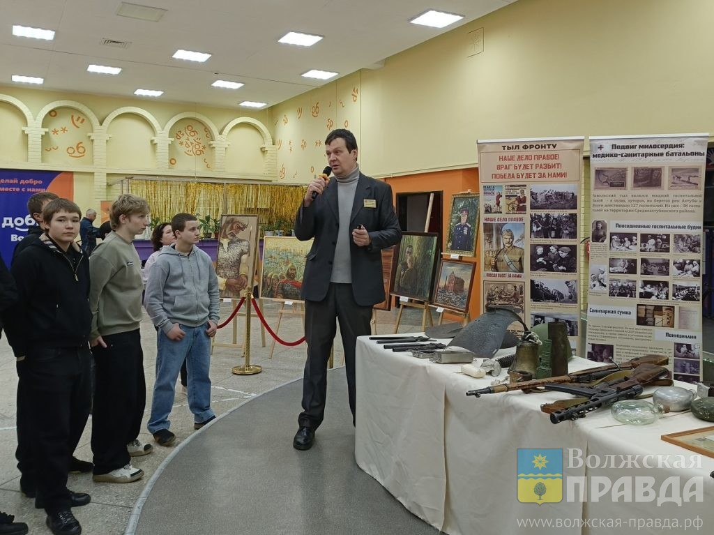 Первое мероприятие из цикла «Защитники Отечества» состоялось на площадке молодежного центра «Юность» 18 февраля. Его участниками стали ученики 9-10-х классов волжской школы № 28. Прямо в фойе для р 4d1ебят была развернута передвижная выставка фронтовых экспонатов времен Великой Отечественной войны, найденных поисковиками на местах бывших боев или переданных в дар ветеранами. Старший научный сотрудник музея памяти солдат войны и органов правопорядка Максим Опалев рассказал старшеклассникам о роли Заволжья в Сталинградской победе, которая стала переломным моментом всей Второй Мировой. Именно левый берег Волги стал фундаментом славной победы наших войск в Сталинградском сражении. Здесь размещались госпитали, советские военные аэродромы, базировались корабли Волжской военной флотилии и штаб фронта.