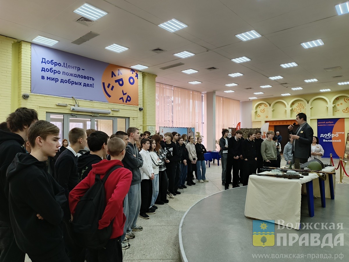 Первое мероприятие из цикла «Защитники Отечества» состоялось на площадке молодежного центра «Юность» 18 февраля. Его участниками стали ученики 9-10-х классов волжской школы № 28. Прямо в фойе для р 4d1ебят была развернута передвижная выставка фронтовых экспонатов времен Великой Отечественной войны, найденных поисковиками на местах бывших боев или переданных в дар ветеранами. Старший научный сотрудник музея памяти солдат войны и органов правопорядка Максим Опалев рассказал старшеклассникам о роли Заволжья в Сталинградской победе, которая стала переломным моментом всей Второй Мировой. Именно левый берег Волги стал фундаментом славной победы наших войск в Сталинградском сражении. Здесь размещались госпитали, советские военные аэродромы, базировались корабли Волжской военной флотилии и штаб фронта.