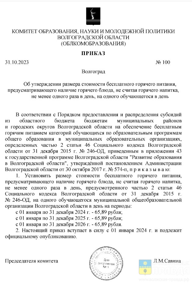 Напомним, что приказ Комитета образования, науки и молодежной политики Волгоградской области от 31.10.2023 № 100 «Об утверждении размера стоимости бесплатного горячего питания, предусматривающего наличие горячего блюда, не считая горячего напитка, не менее одного раза в день, на одного обучающего в день» предусматривает субсидии на горячее питание школьникам из областного бюджета. Указанный нормативный акт еще в 2023-м на три года вперёд (с 2024 по 2026-й) установил размер доплаты в сумме 65,89 руб.