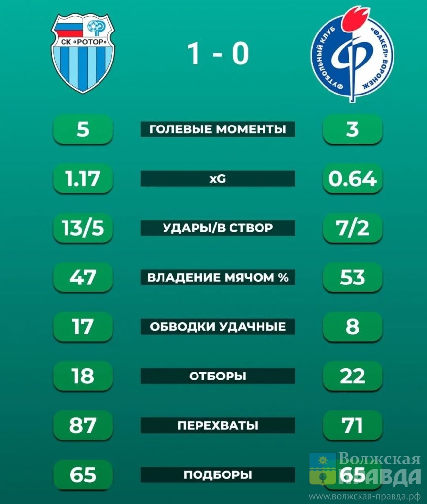 Матч завершился победой хозяев поля со счётом 1:0. Единственный мяч в створ ворот на 23-й минуте первого тайма забил нападающий волгоградцев Абу-Саид Эльдарушев, удачно сыграв на добивании.