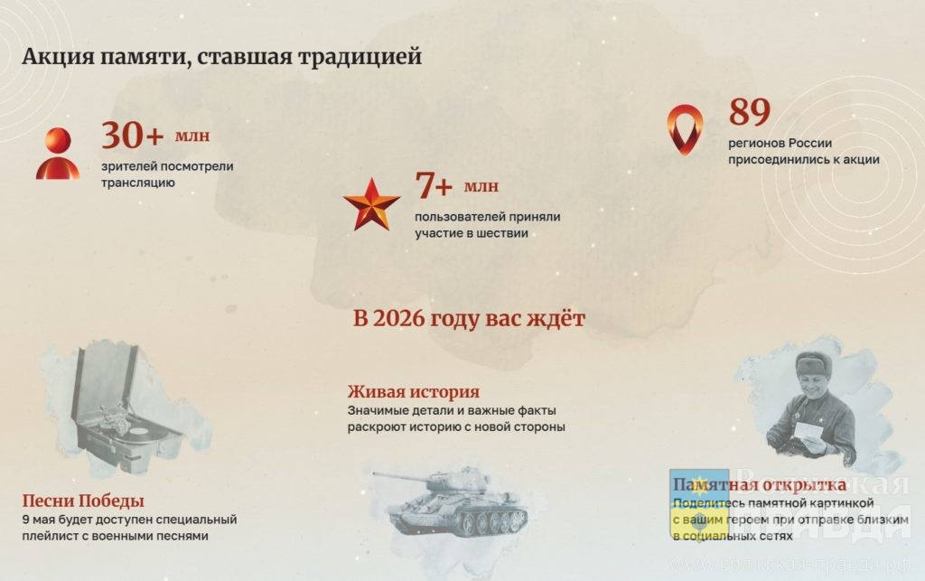 Для этого нужно до 6 мая зарегистрироваться на официальном сайте акции 2026.polkrf.ru и добавить информацию о своём герое – участнике Великой Отечественной войны, труженике тыла или любом другом человеке, внесшем свой вклад в приближение Победы и самоотверженно служившем Родине.