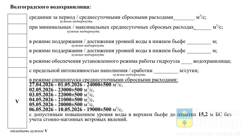 Согласно «Указаниям о режимах работы гидроузлов водохранилищ Волжско-Камского каскада», Волжская ГЭС приступила к постепенному снижению максимальных сбросов воды 27 апреля. К 1 мая они составят 24000±500 м³/с.