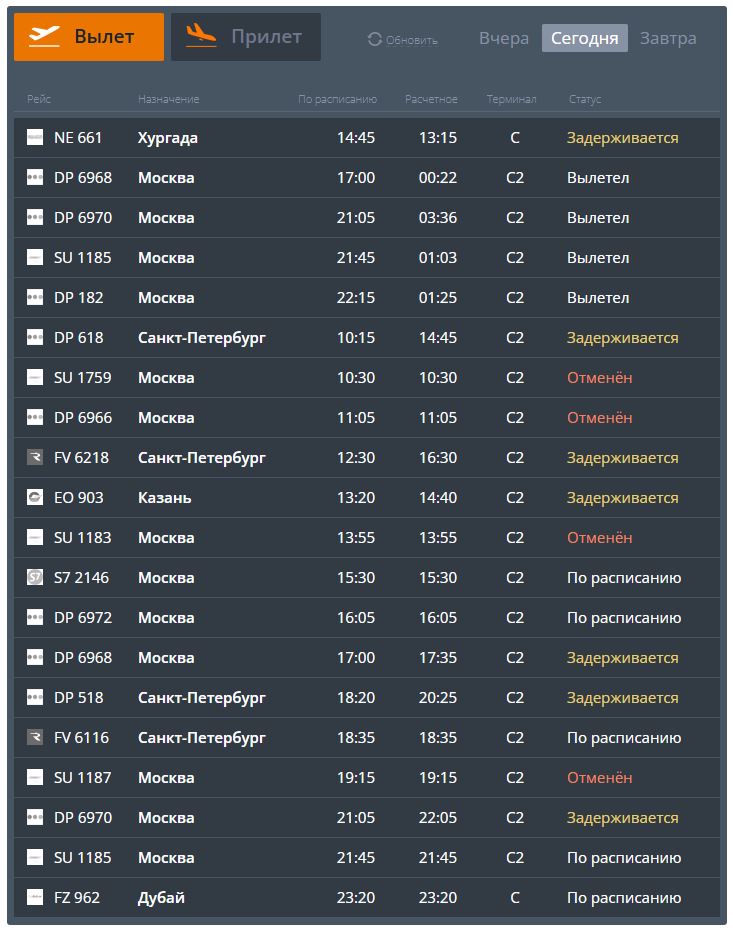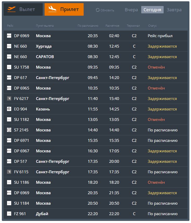 В электронном онлайн-табло Международного аэропорта Волгоград отменены ряд рейсов в московском направлении, задерживается прибытие рейсов из Санкт-Петербурга, Казани, Саратова, Хургады. Время вылетов некоторых воздушных судов тоже смещается. Задерживается утренняя отправка рейсов в северную столицу, Казань. Со вчерашнего дня не может вылететь самолёт NE 661 авиакомпании Nesma Airlines сообщением «Волгоград – Хургада».