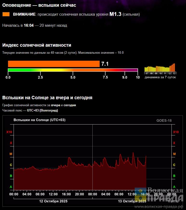 Стоит отметить, что в течение 13 октября на солнце зарегистрировано более 14 вспышек, в том числе 2 из них М-класса. Самую сильную из них учёные классифицировали как M2.7. Вспышка состоялась 13 октября в 11:55 по московскому времени.