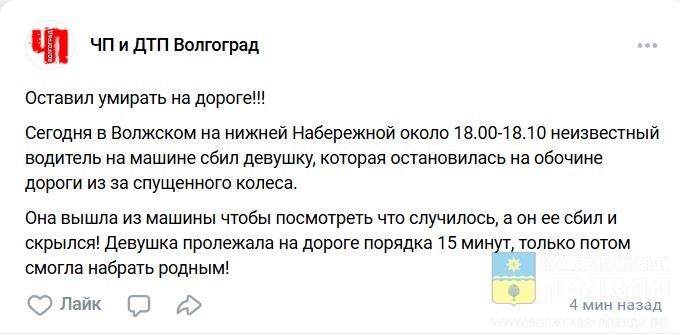 Информация об отвратительном поступке неизвестного водителя появилась на телеграмм канале экс-депутат Волжской городской Думы Романа Халикова и на ВК странице сообщества «ЧП и ДТП Волгоград» сегодня, 16 октября, поздним вечером.