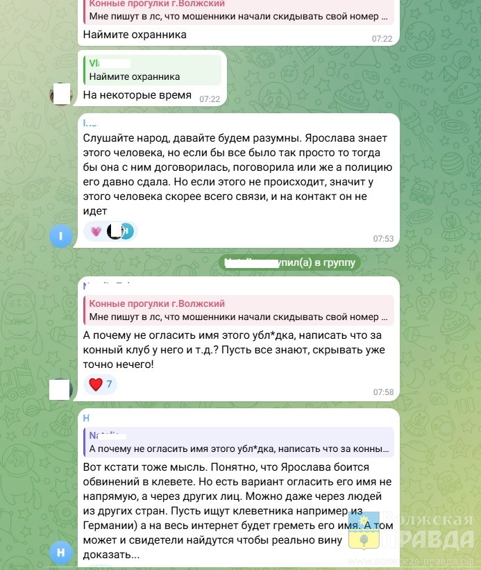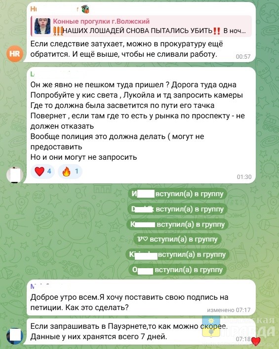 Стоит особо отметить, что в телеграм-чате конного клуба идёт активное обсуждение происходящего. Люди выдвигают одну версию за другой, предлагают помощь, выражают сочувствие Ярославе и негодование в адрес губителя лошадей.