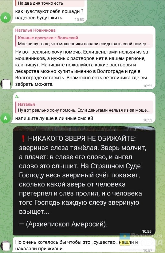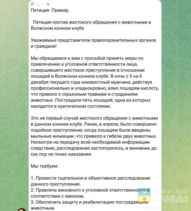 Активисты пишут о создании петиции против жестокого обращения с животными в волжском конном клубе. Они предлагают обратиться в прокуратуру, запросить видеозаписи у ветлечебници и АЗС, мимо которых проезжал отравитель, требуют предать огласке имя живодёра и даже цитируют архиепископа Амвросия: