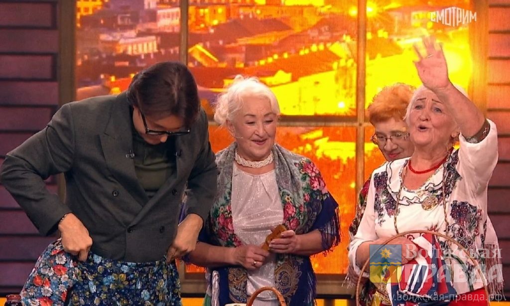 Однако самой фееричной частью выступления стала церемония вручения подарков, привезённых пенсионеркой для ведущего. После возгласа: «Я ж не знала, что Вам везти!..», женщина начала извлекать из мешка дары волгоградчины…