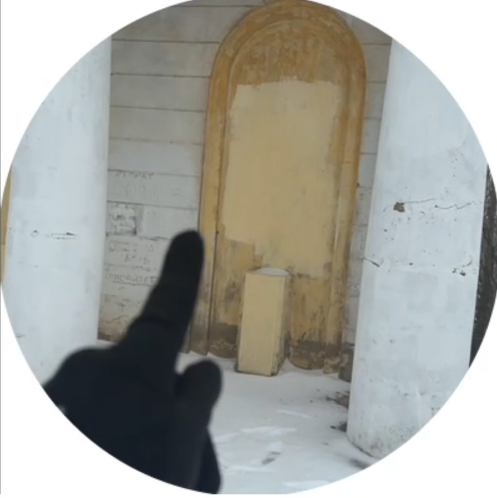Наконец-то девушка преодолевает полуразрушенную входную группу строения, и рассматривает архитектурные тонкости павильона траурных собраний.