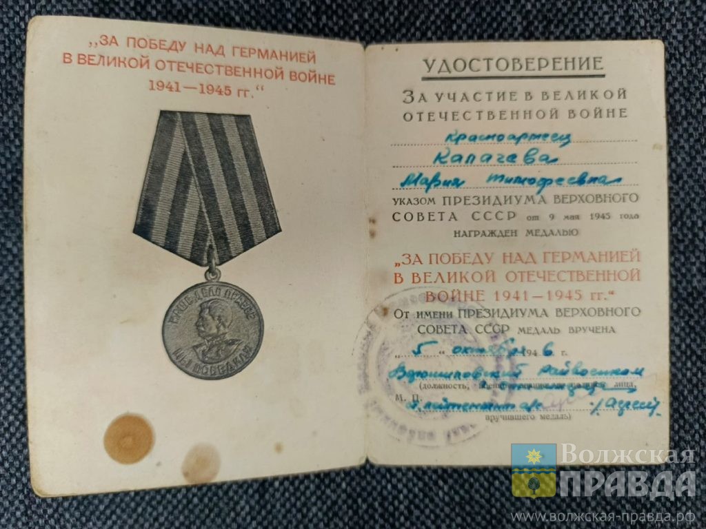 О наградах Василия Александровича мне неизвестно, а вот Мария Тимофеевна была награждена медалями «За победу над Германией», «За оборону Сталинграда», «За боевые заслуги», орденами Красной звезды, Отечественной войны II степени и другими наградами.