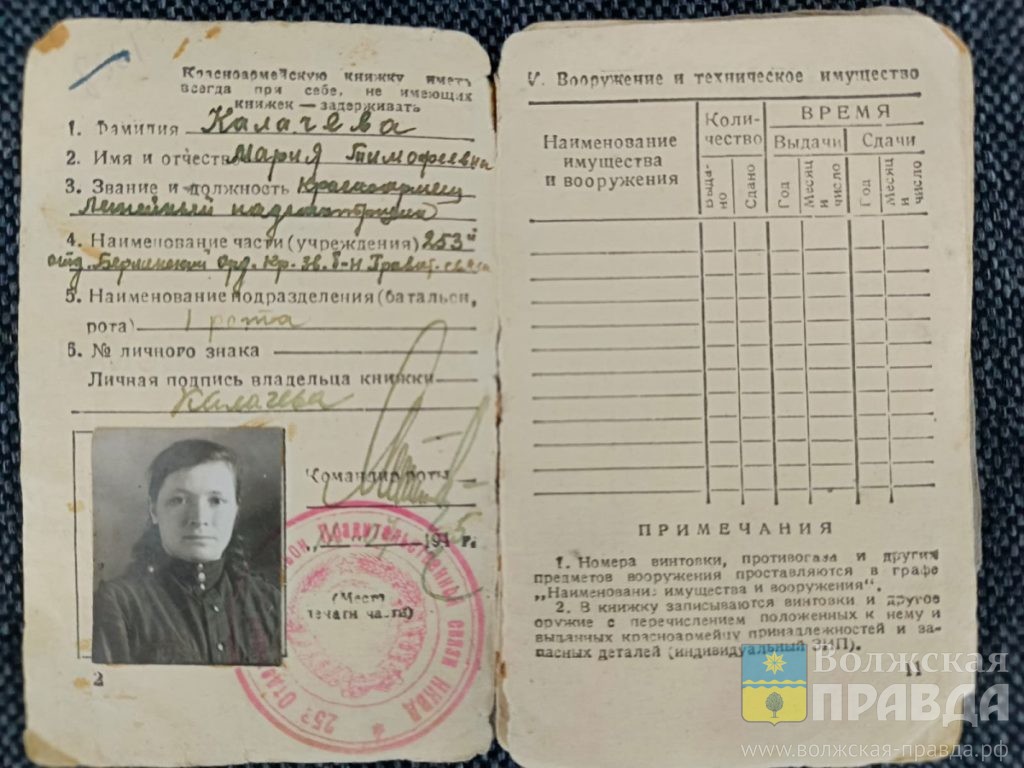 Мама моей супруги Мария Тимофеевна Краева (в девичестве Калачёва) родилась в 1920 году в Иловлинском районе Сталинградской области, окончила четыре класса начальной школы, работала в колхозе счетоводом. В 1942 году по мобилизации была направлена связистом на Сталинградский фронт в 253-й отдельный батальон правительственной связи, прошла всю Европу, 9 мая 1945 года встретила в Берлине.