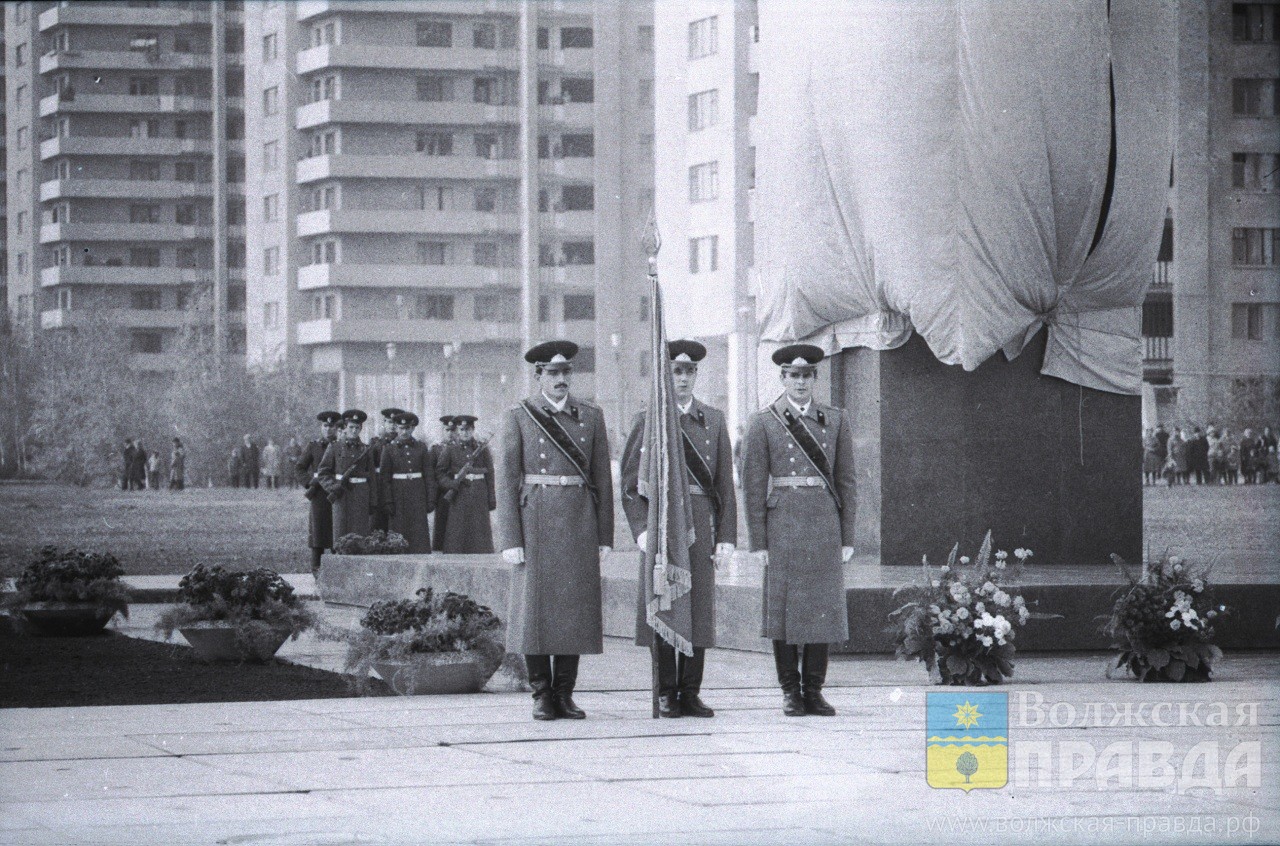 Речь шла о снимке Юрия Протопопова, который запечатлел открытие памятника Ленину на главной площади Волжского. Произошло это знаменательное событие 21 октября 1984 года. Тогда в центр города пришли тысячи людей, всё было торжественно, с речами высокопоставленных руководителей, оркестром, маршем солдат войсковой части № 73420. Она же «поставляла» на праздники знаменосцев, которые придавали событию пущую значимость. Именно о них и говорил заглянувший в редакцию Вадим Козлов. Он сам в 80-е служил на острове Зелёном и нередко тоже входил в группу знаменосцев, но в октябре 1984-го находился в отпуске.