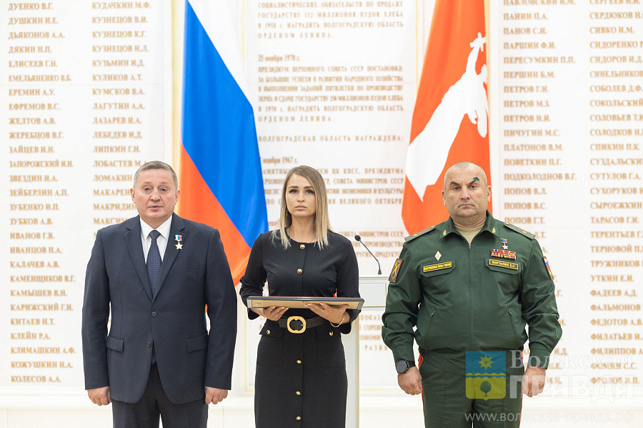 — В ходе специальной военной операции, в сложнейших боевых условиях Михаил Иванович Подшибякин всегда действовал смело и решительно, проявляя личное мужество, подлинный героизм и самоотверженность. Ваш сын, Ваш муж был и навсегда останется настоящим офицером, настоящим Человеком, настоящим Героем, который погиб, до конца выполнив свой воинский долг, — обратился к маме и супруге Михаила Подшибякина губернатор Андрей Бочаров. — Имя Героя России Михаила Ивановича Подшибякина, золотом высеченное здесь, на стенах Зала Воинской и Трудовой Славы Волгоградской области, навсегда останется в истории России, в истории Волгоградской области. Для нас сегодня большая честь по поручению Президента России Владимира Владимировича Путина передать Вашей семье Золотую Звезду Героя Российской Федерации».